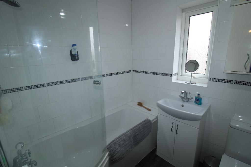 Bathroom: 8'1" x 8'4" UPVC obscure double-glazed window to the front aspect, Low level wc, sink in vanity unit, panel bath with chrome shower over, heated towel rail, part tile walls, lino flooring.