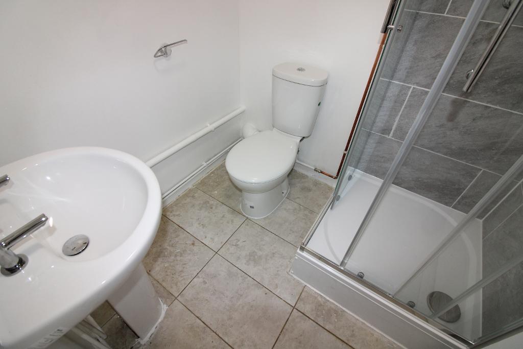 Bathroom: 5'5" x 5'0" Low level WC, sink with pedestal, stand in shower cubicle, part tiled walls, tiled floor, wall mounted electric heater, extractor fan.