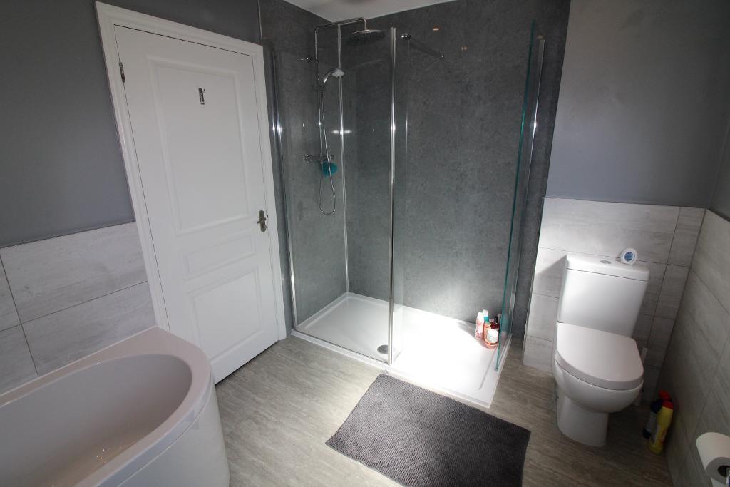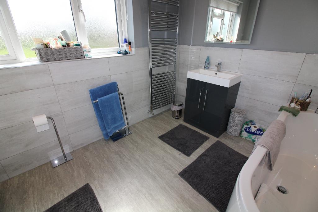 Family Bathroom: UPVC double glazed obscure window to the rear aspect, low level WC, sink with built in vanity unit providing storage, panel bath, stand in double shower unit, wall mounted heated towel rail,