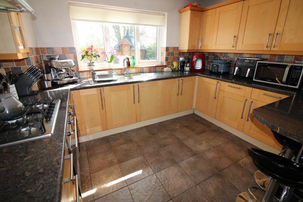 Kitchen: UPVC double glazed window to the rear aspect, Mixed and eye base level units with work surface over and tiled splash backs, built in oven with five burner gas hob and extractor over, stainless steel sink, tiled floor, through to the utility room.