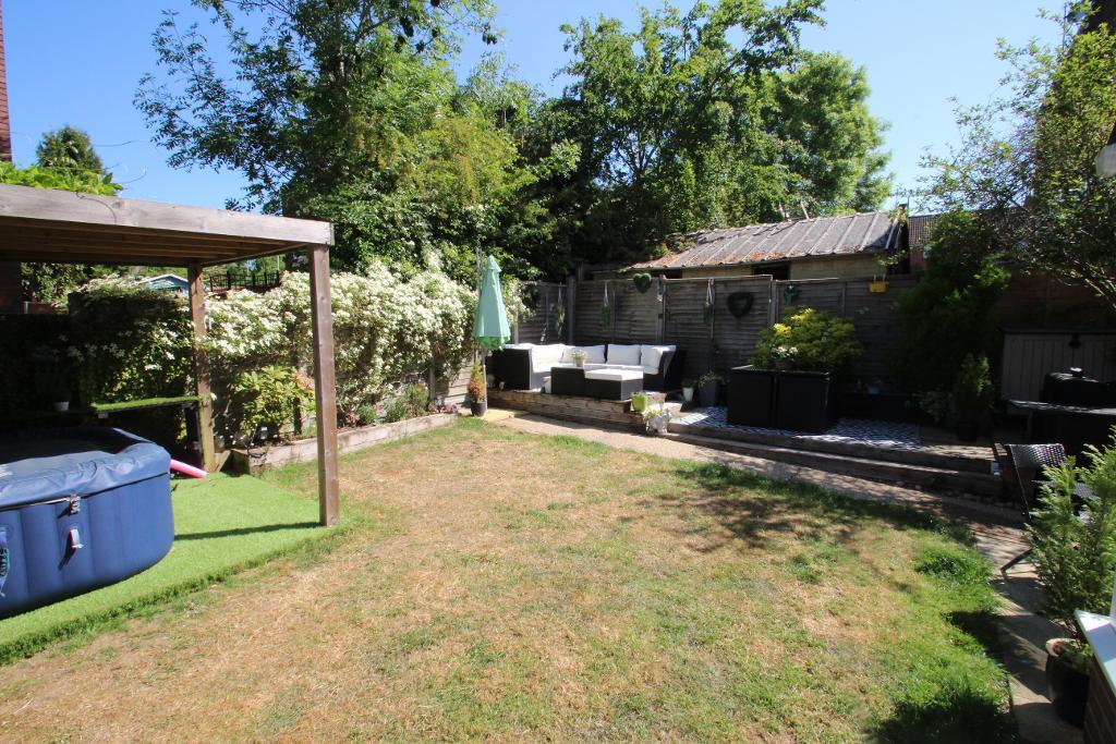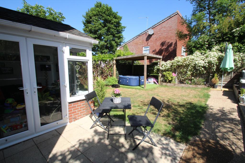 Rear Garden: Slabbed patio, laid lawn, wood fence surround, raised decking area, door that leads directly into the garage, secure gate that provides access to the front of the property, outside tap.