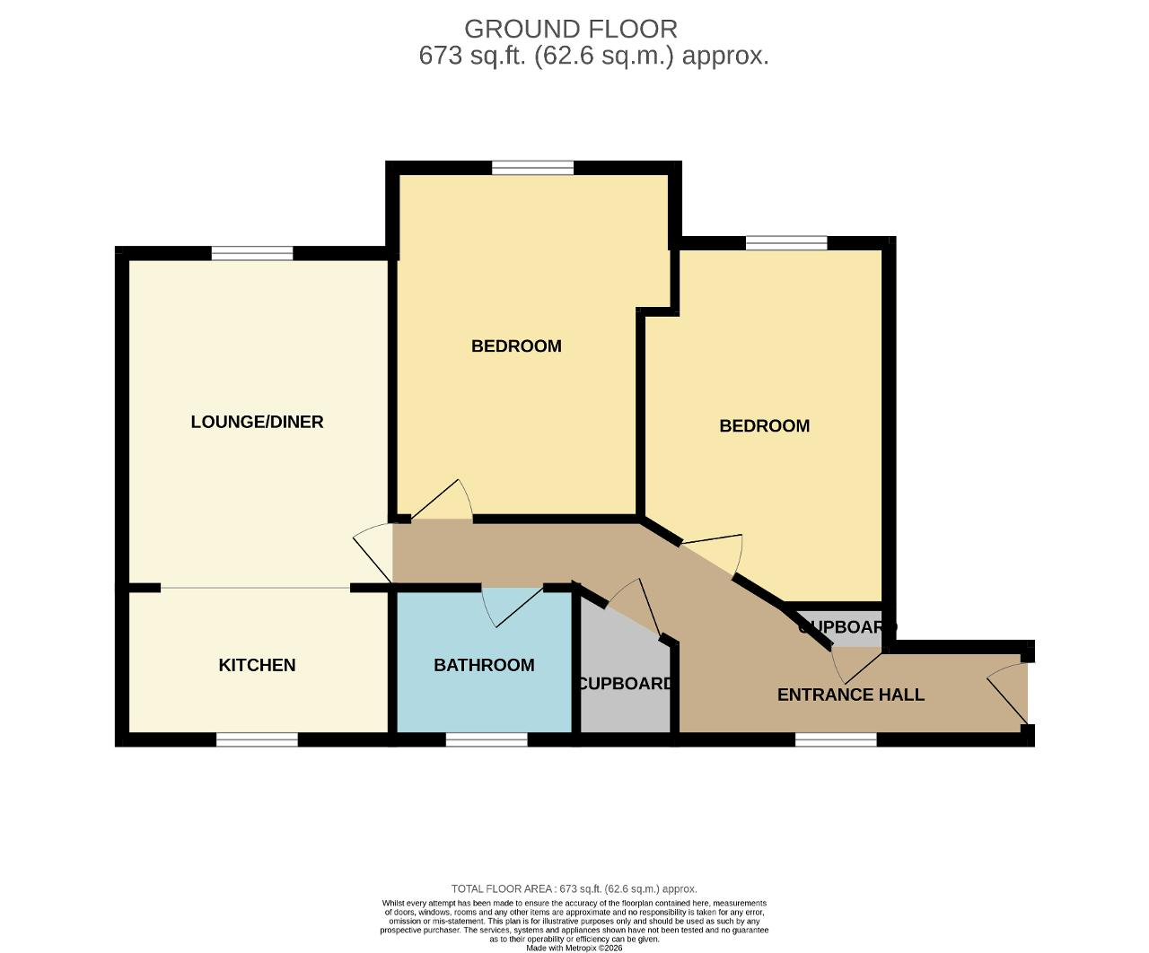 Hallway: Doors to open plan kitchen/ lounge area, two bedrooms, bathroom, two large storage cupboards, vinyl flooring, radiator, double glazed UPVC window to the side aspect.