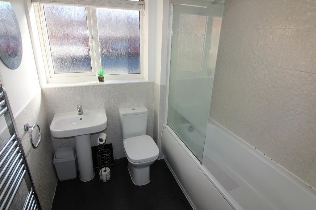 Bathroom: 6'7" x 6'1" UPVC double glazed obscure window to the rear aspect, low level WC, sink with pedestal , panel bath with shower over, tiled walls, laminate flooring, extractor fan, heated towel rail.
