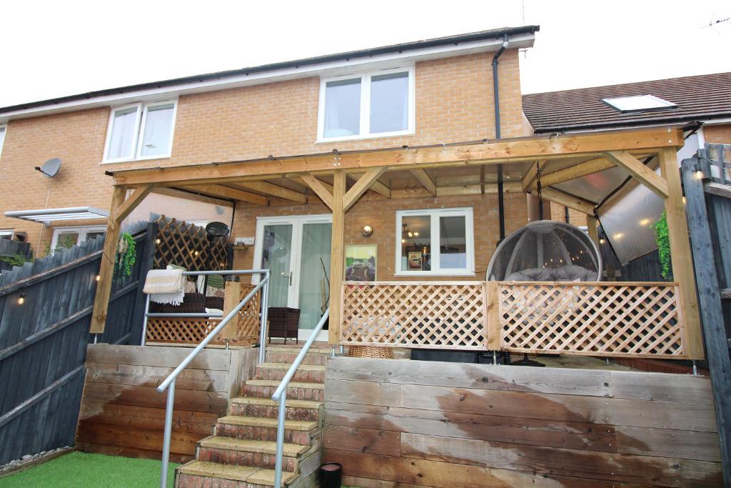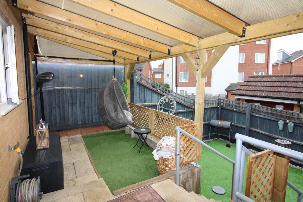 Rear Garden: Fully enclosed with wooden fence, secure wood gate provides access to the front of the property, decking area under cover, steps leading down to artificial lawn with garden shed, outside tap.