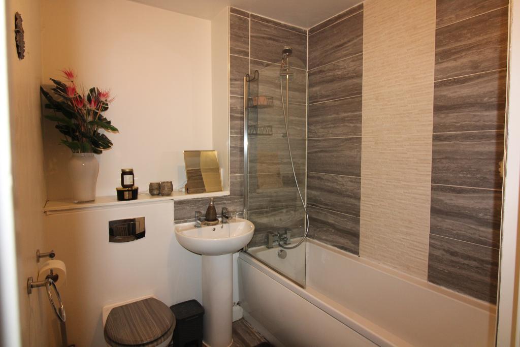 Bathroom: 6'9" x 6'3" Low level WC, sink with pedestal, panel bath with shower over, radiator.