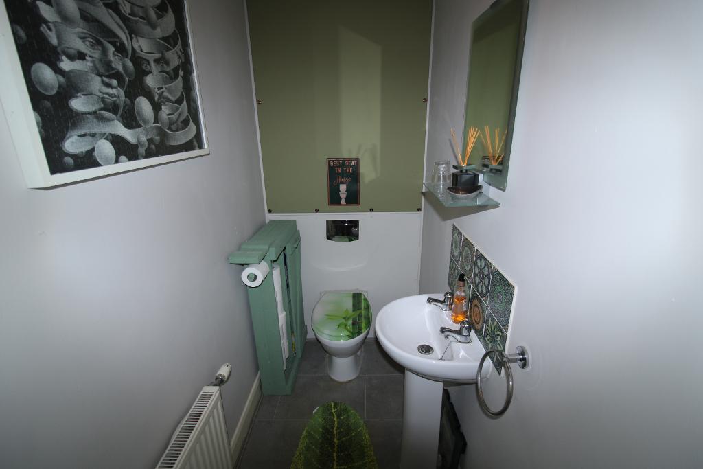 Cloakroom: 6'5" x 3'4" Low level WC, sink with tiled splash back, radiator.