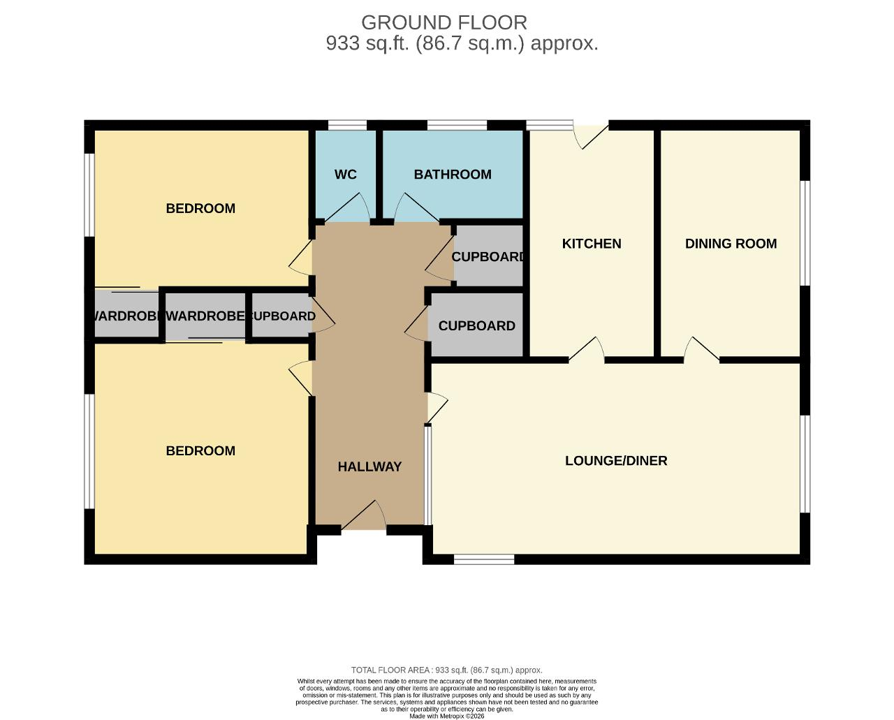Entrance Hall: Doors lead to the two bedrooms, lounge, bathroom, toilet airing cupboard, further two cupboards one of which houses the gas boiler, loft hatch providing access to the loft space, radiator.