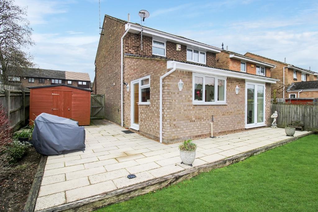 Rear Garden: Laid lawn, large slabbed patio area with a slabbed pathway that leads to the rear gate, secure wooden gate provides access to the driveway and front of the property, wood fence surround, shed with power and light, outside tap.
