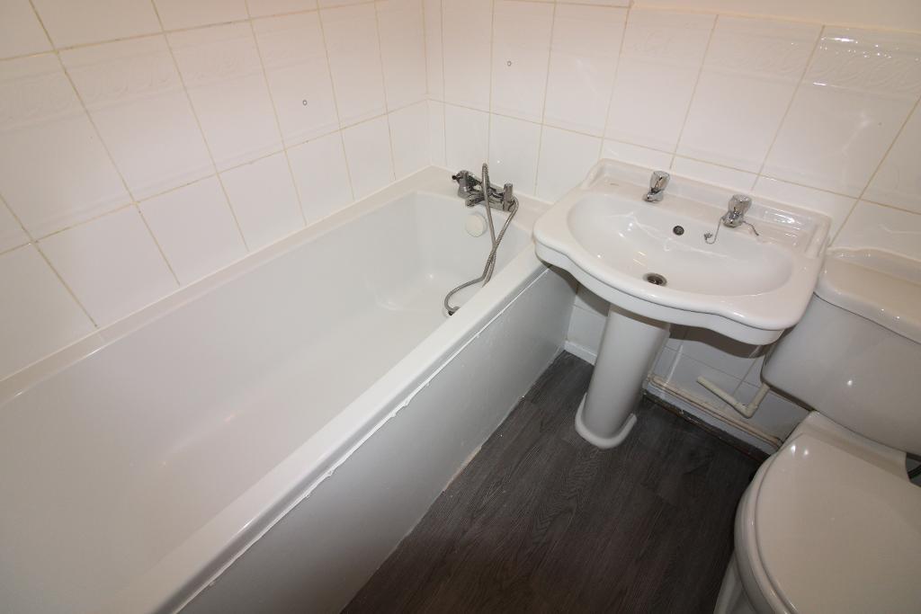 Bathroom: 6'0" x 5'6" Low level WC, sink with pedestal, panel bath, part tiled walls, radiator.